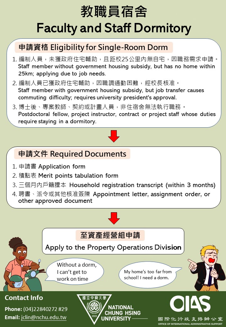 To facilitate international academic exchanges, the University provides the following resources for visiting international guests: Short-term visiting ID (Office of International Affairs), University promotional videos/materials (Secretariat Office), contracted hotels (General Affairs Office-approved contractors), NCHU-branded souvenirs (Caves Books), etc. Please contact the Office of International Affairs’ Division of Academic Exchange for guests invited by a university-level unit.