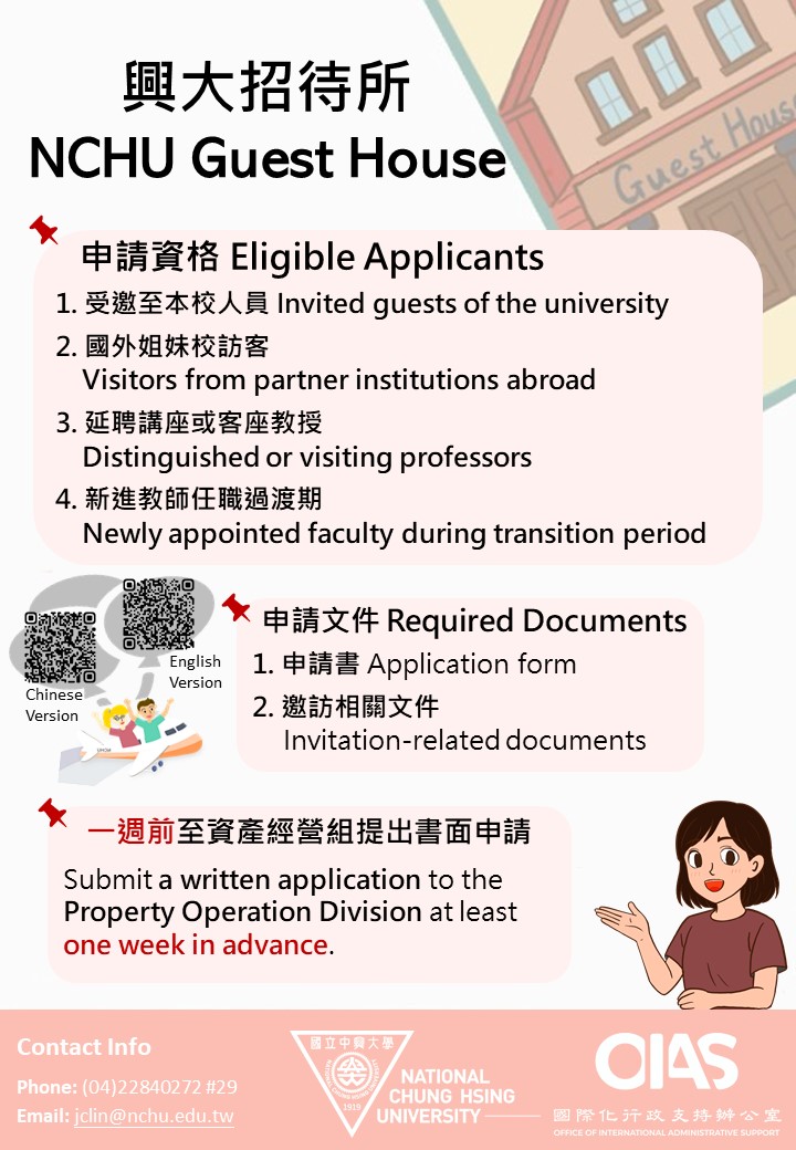 提供受邀至本校進行短期教學、研究、演講、開會之學者、專家或行政公務人員住宿,所需文件: